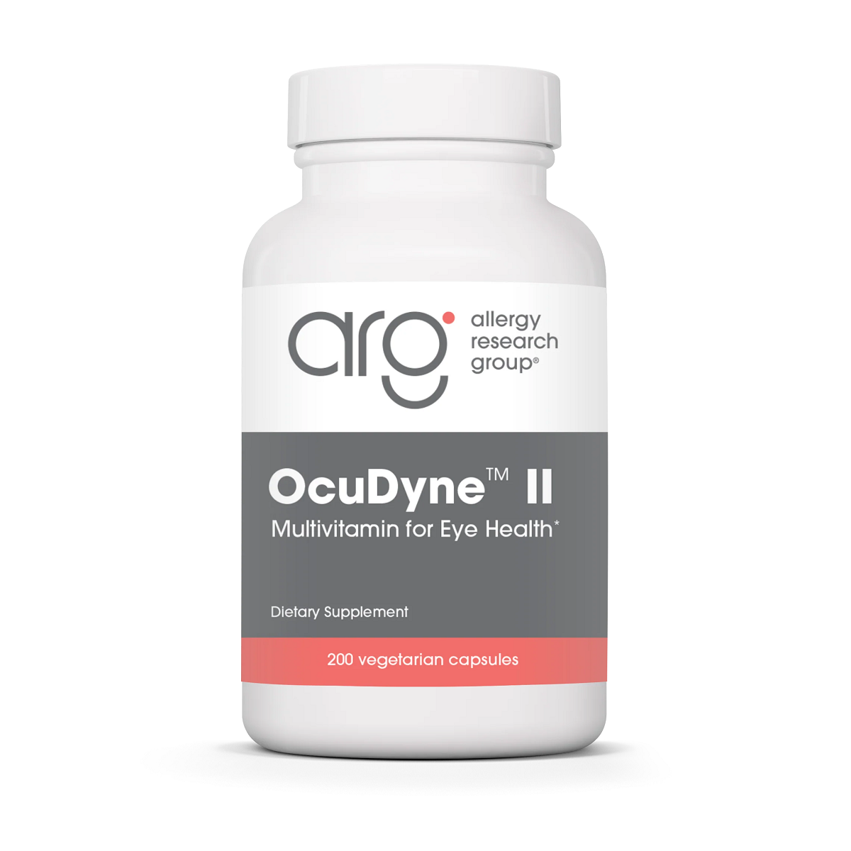 OcuDyne™ II was originally formulated for Allergy Research Group® by Jonathan Wright, M.D., and Alan R. Gaby, M.D. OcuDyne™ II includes folate as 5-MTHF, gamma-tocopherol, tocotrienols, vitamin D, alpha-lipoic acid, and lycopene, as well as antioxidants, key amino acids, minerals, bioflavonoids such as quercetin, enhanced lutein and zeaxanthin, and extracts of ginkgo and bilberry. In addition to eye support, it may be used as a multivitamin, multimineral formula.*