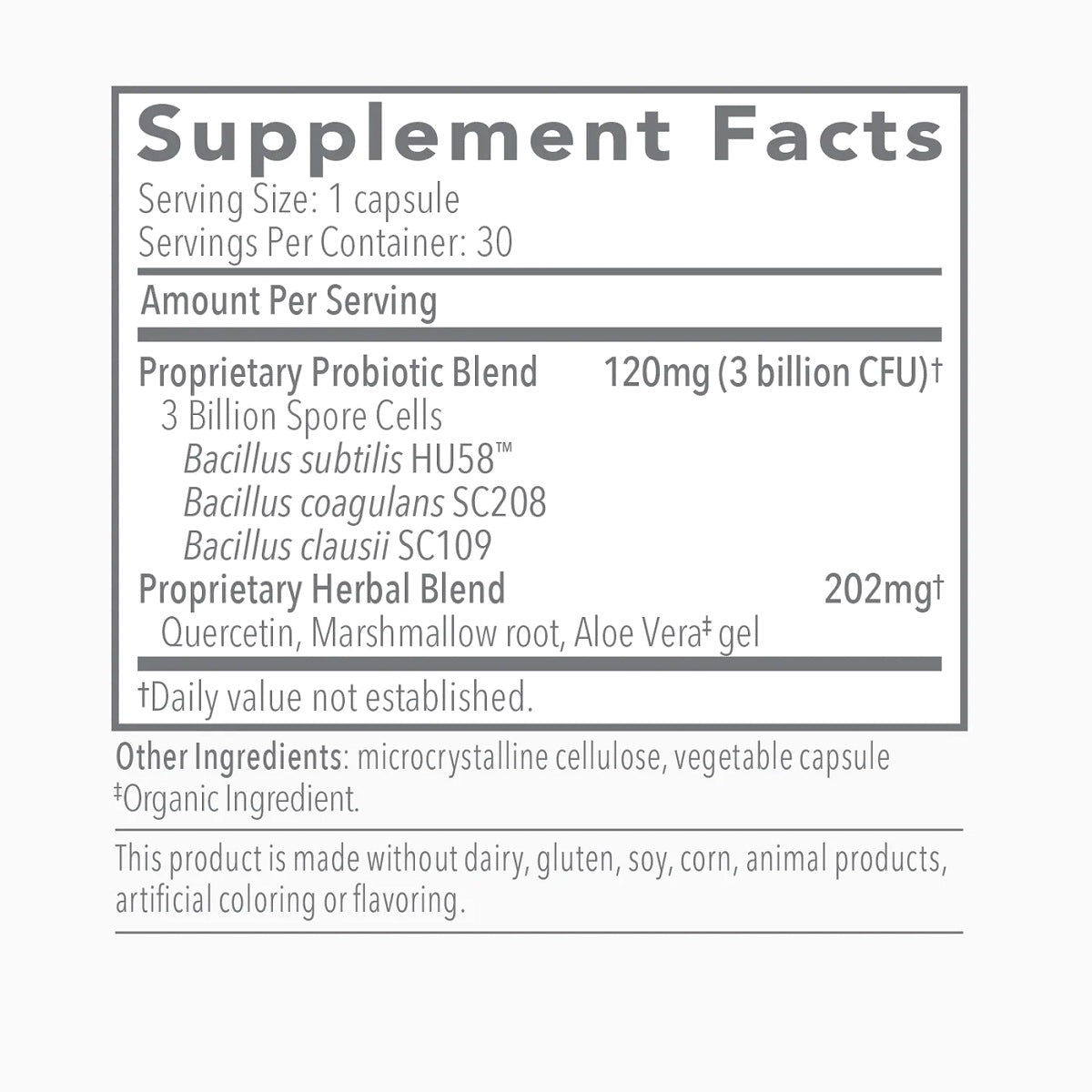 Proprietary Probiotic Blend: 3 Billion Spore Cells: Bacillus subtilis HU58™ Bacillus coagulans SC208, Bacillus clausii SC109