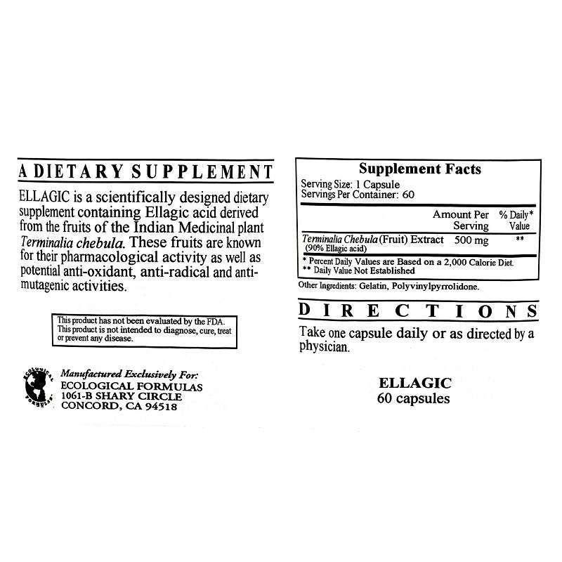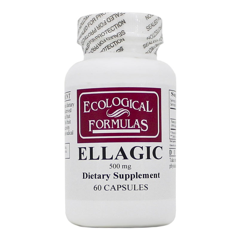 Ellagic 500 mg by Ecological Formulas is a dietary supplement designed to promote healthy cardiovascular function in addition to protecting cellular DNA through antioxidant protection. The key ingredient in Ellagic 500 mg by Ecological Formulas is ellagic acid, sourced from the fruits of a medicinal plant in India known as Terminalia chebula. Studies have found that ellagic acid has potent antibacterial and antiviral properties, including the ability to neutralize dangerous toxins in the body.