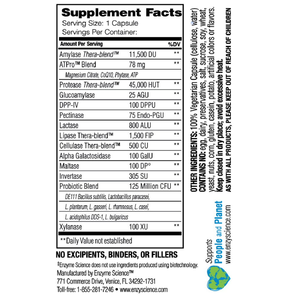 Enzyme Science formulates each enzyme-focused product with exclusive Thera-blend enzymes. The Thera-blend process is scientifically designed to provide optimal solutions for digestive health and wellness. These unique protease, amylase, cellulase, and lipase enzymes are comprised of multiple variants which are blended to work synergistically throughout the broad pH range of the human body.
