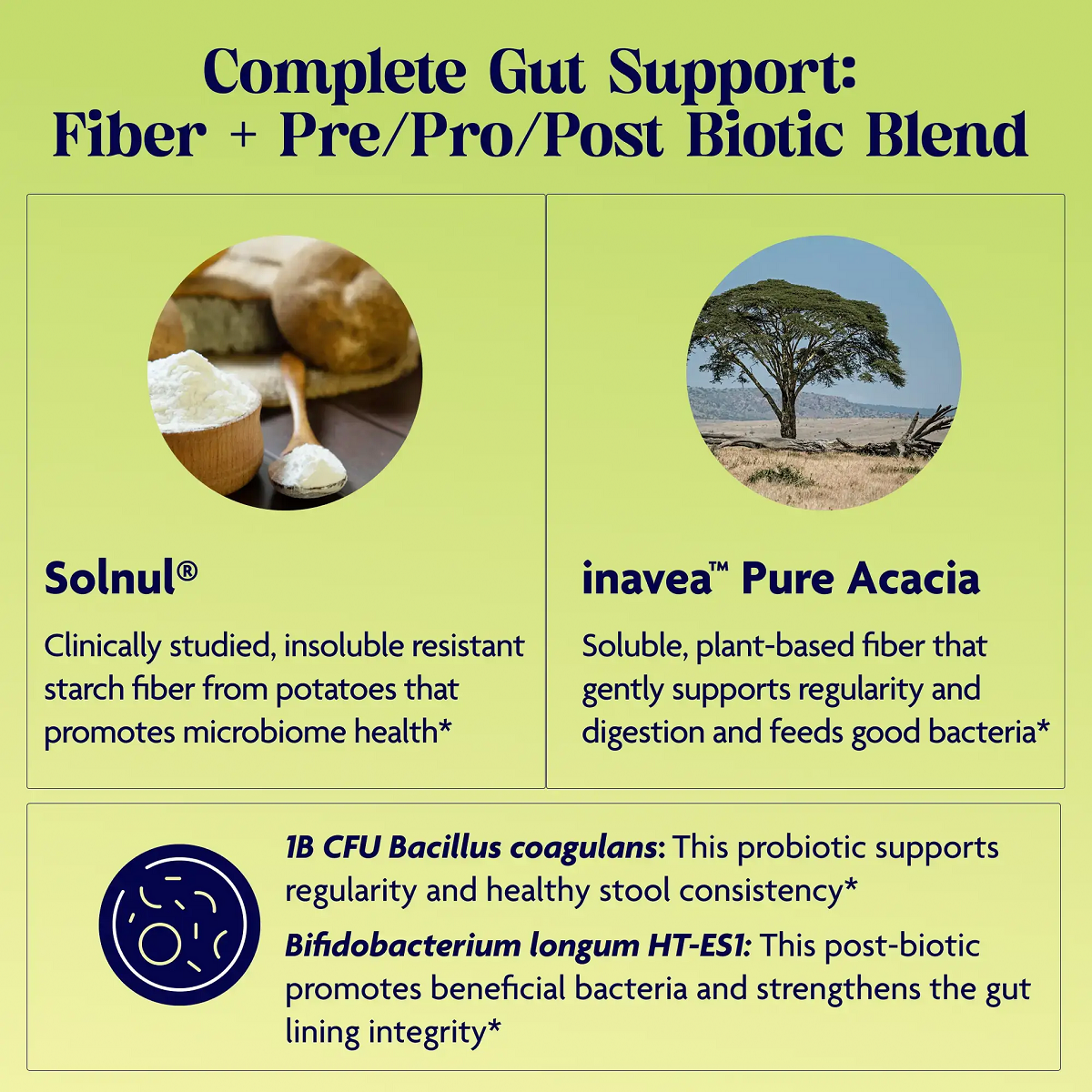 These ingredients work together to create a comprehensive formula that goes beyond basic fiber supplements. The synergy of prebiotics, probiotics, and postbiotics helps support daily regularity, digestive comfort and the foundational health of the microbiome.*