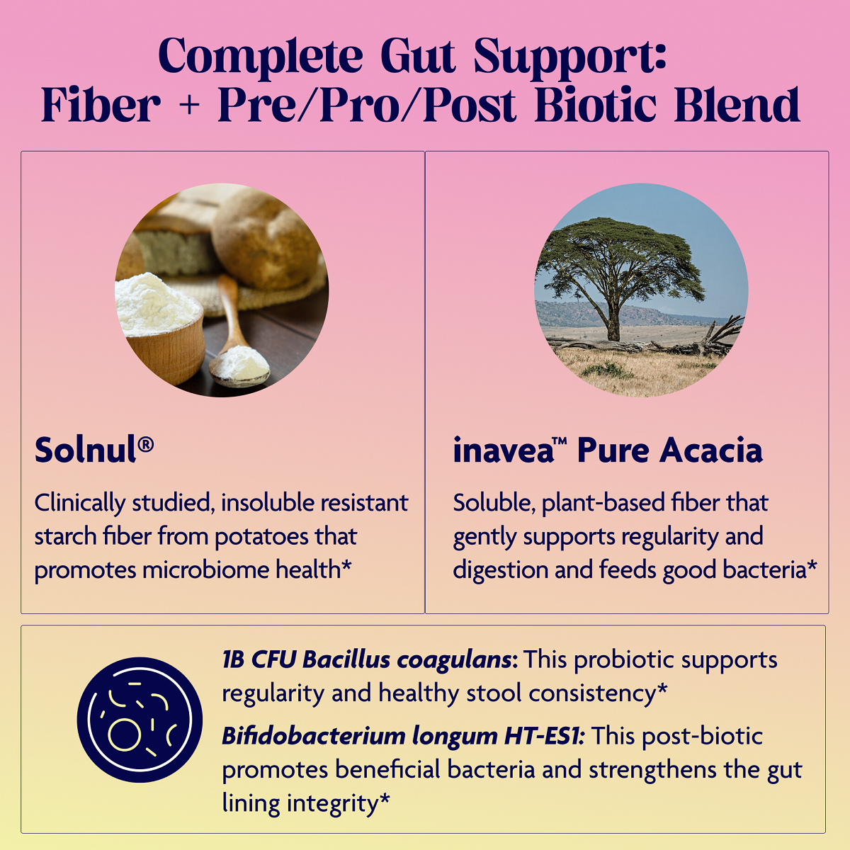 These ingredients work together to create a comprehensive formula that goes beyond basic fiber supplements. The synergy of prebiotics, probiotics, and postbiotics helps support daily regularity, digestive comfort, and the foundational health of the microbiome.*