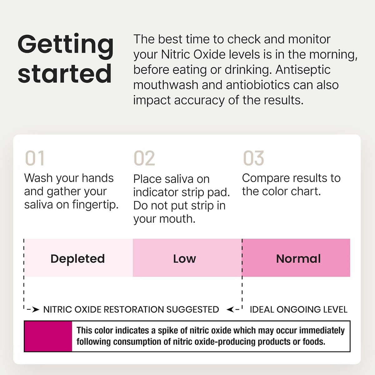 USING THE NITRIC OXIDE INDICATOR STRIPS Place a drop of saliva on the indicator strip first thing in the morning, before eating and drinking anything. Then compare the indicator strip with the accompanying color chart on our N-O Indicator Strip packaging.