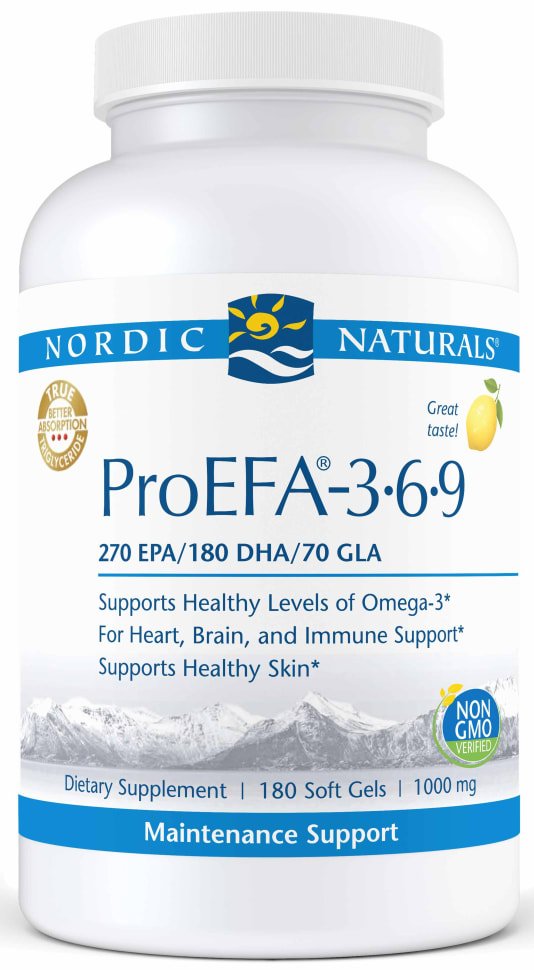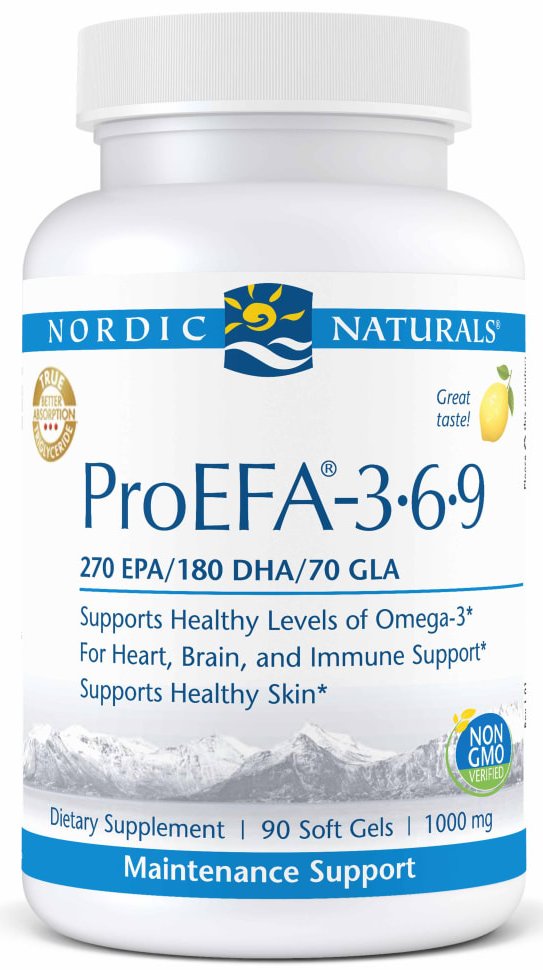 ProEFA-3.6.9® combines non-concentrated omega-3s EPA and DHA from fish oil with GLA from borage oil and omega-9 to provide comprehensive polyunsaturated fatty acid support for cardiovascular health, brain function, and joint flexibility.* Beneficial omega-6 GLA works alongside omega-3s EPA and DHA to promote healthy skin, hair, and nails.* Can be paired with any Nordic Naturals omega-3 product for increased EPA+DHA support. Available in liquid and soft gels.
