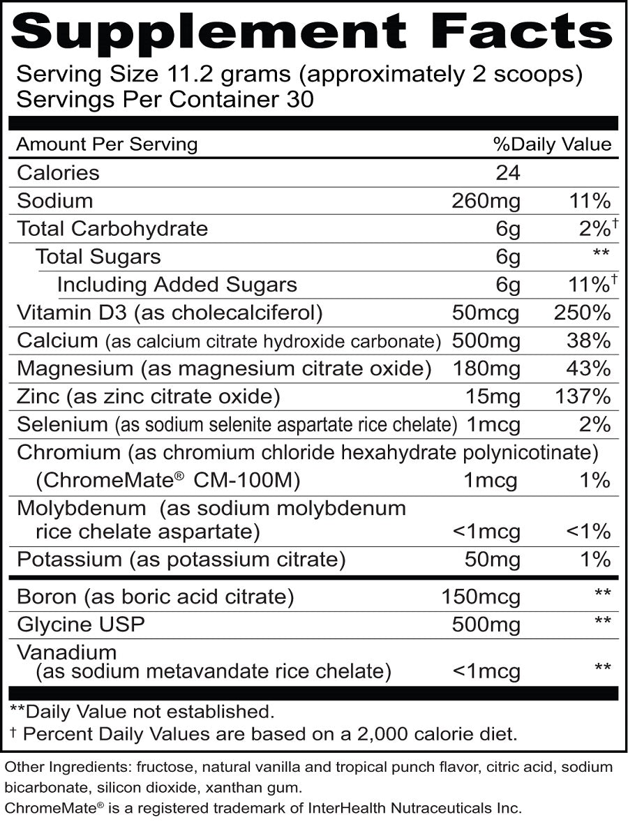Fructose, natural vanilla flavor, natural tropical punch flavor, sodium bicarbonate, xanthan gum, beta-cyclodextrin, silicon dioxide, citric acid, dicalcium phosphate, rice protein, dextrose, tapioca flour.