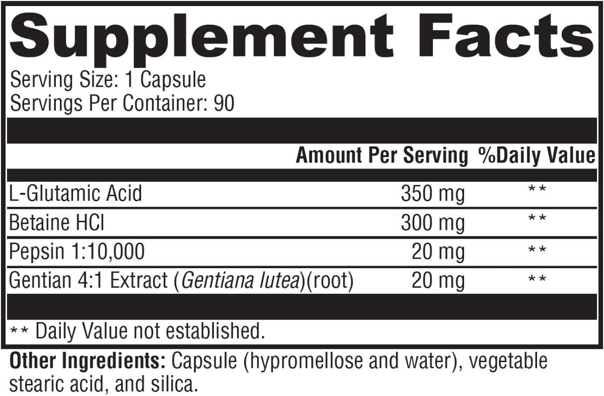 Betaine HCL + Pepsin provides a variety of health-supportive factors—l-glutamic acid, betaine HCl, and pepsin, a proteolytic enzyme, assist in protein digestion. Gentian root, an herbal bitter, promotes the normal secretion of saliva and gastric acid for digestive support. HCl (hydrochloric acid) supports nutrient absorption and helps maintain a healthy gastric pH, which, in turn, supports healthy gastric ecology.*