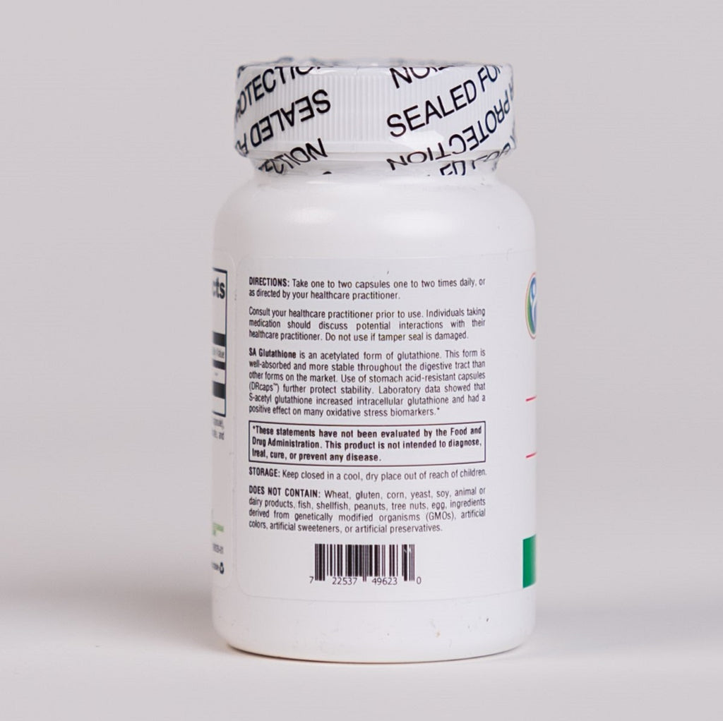 SA Glutathione is an acetylated form of glutathione. This form is well-absorbed and more stable throughout the digestive tract than other forms on the market. The use of stomach acid-resistant capsules (DRcaps™) further protects stability. Laboratory data showed that SA Glutathione increased intracellular glutathione and had a positive effect on many oxidative stress biomarkers. *