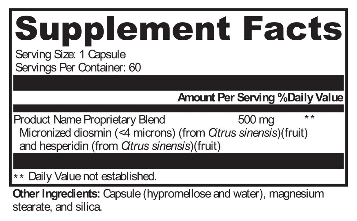 | Product Name Proprietary Blend Micronized diosmin (<4 microns) (from Citrus sinensis)(fruit) and hesperidin (from Citrus sinensis) (fruit) | 500 mg | ** |