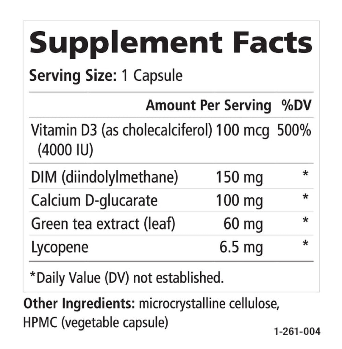 Vitamin D3 (as cholecalciferol) 100 mcg 500% (4000 IU), DIM (diindolylmethane), Calcium D-glucarate, Green tea extract (leaf), Lycopene.