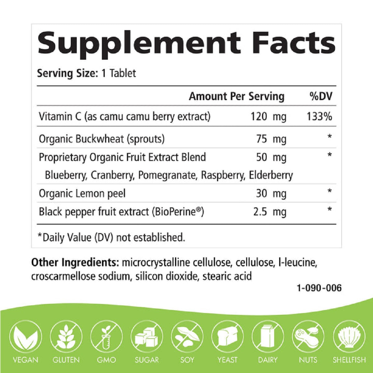 Whole-C™ is the most potent source of this whole food vitamin C complex ever created. It combines buckwheat sprouts, lemon peel, elderberries, cranberries, blueberries, raspberries, and pomegranates (all organic) with wildcrafted camu camu from the Amazon rain forest.*