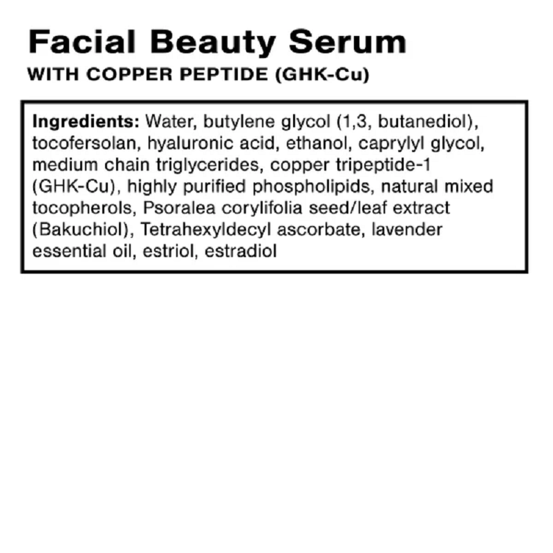 Water, butylene glycol (1,3 butanediol), tocofersolan, hyaluronic acid, ethanol, caprylyl glycol, medium chain triglycerides, copper tripeptide-1 (GHK-Cu), highly purified phospholipids, natural mixed tocopherols, Psoralea corylifolia seed/leaf extract (Bakuchiol), Tetrahexyldecyl ascorbate, lavender essential oil, estriol, estradiol