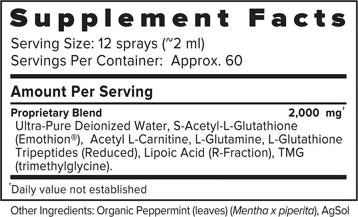 S-Acetyl-L-Glutathione, N-Acetyl L-Cysteine (NAC), Acetyl L-Carnitine, L-Glutamine, L-Glutathione Tripeptides (Reduced), Lipoic Acid (R-Fraction), TMG (trimethylglycine), Peppermint Leaf (Mentha x Piperita), Ascorbic Acid and Natural Trace Minerals.