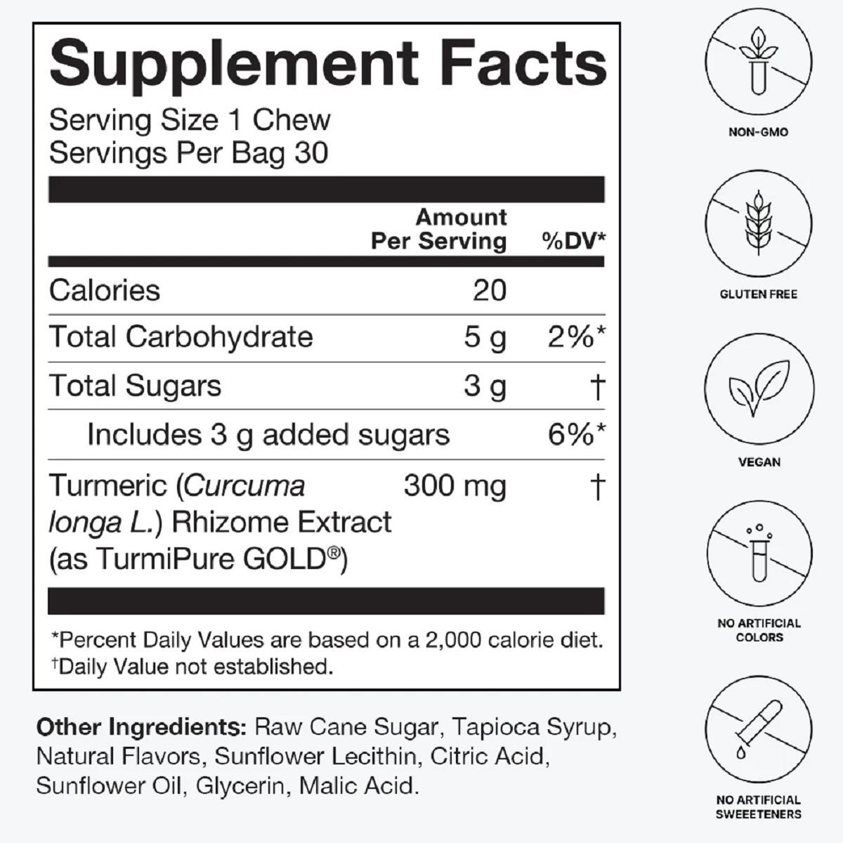 Natural Orange Citrus flavored soft chews featuring clinically studied TurmiPure Gold® Turmeric Extract shown to deliver 24x greater absorption than standard turmeric extracts without requiring the addition of black pepper extract. Each soft chew provides 300mg of TurmiPure Gold® turmeric extract to support a healthy inflammatory response associated physical activity and joint health.* HumanN Turmeric Chews are naturally flavored, gluten-free and non-GMO.