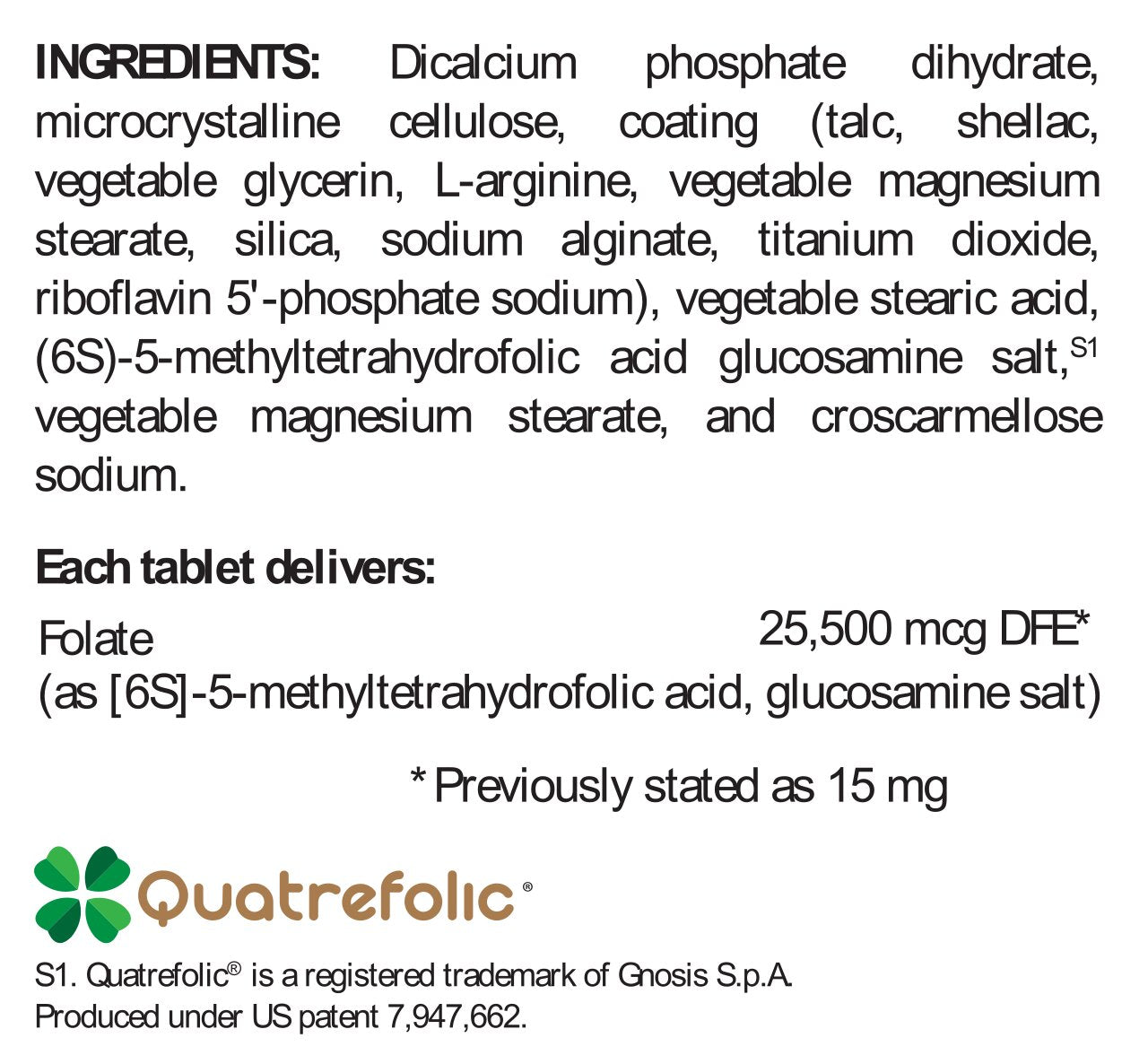 Dicalcium phosphate dihydrate, microcrystalline cellulose, coating (talc, shellac, vegetable glycerin, L-arginine, vegetable magnesium stearate, silica, sodium alginate, titanium dioxide, riboflavin 5’-phosphate sodium), vegetable stearic acid, (6S)- 5-methyl-tetrahydro folic acid glucosamine salt, S1 vegetable magnesium stearate, and croscarmellose sodium.